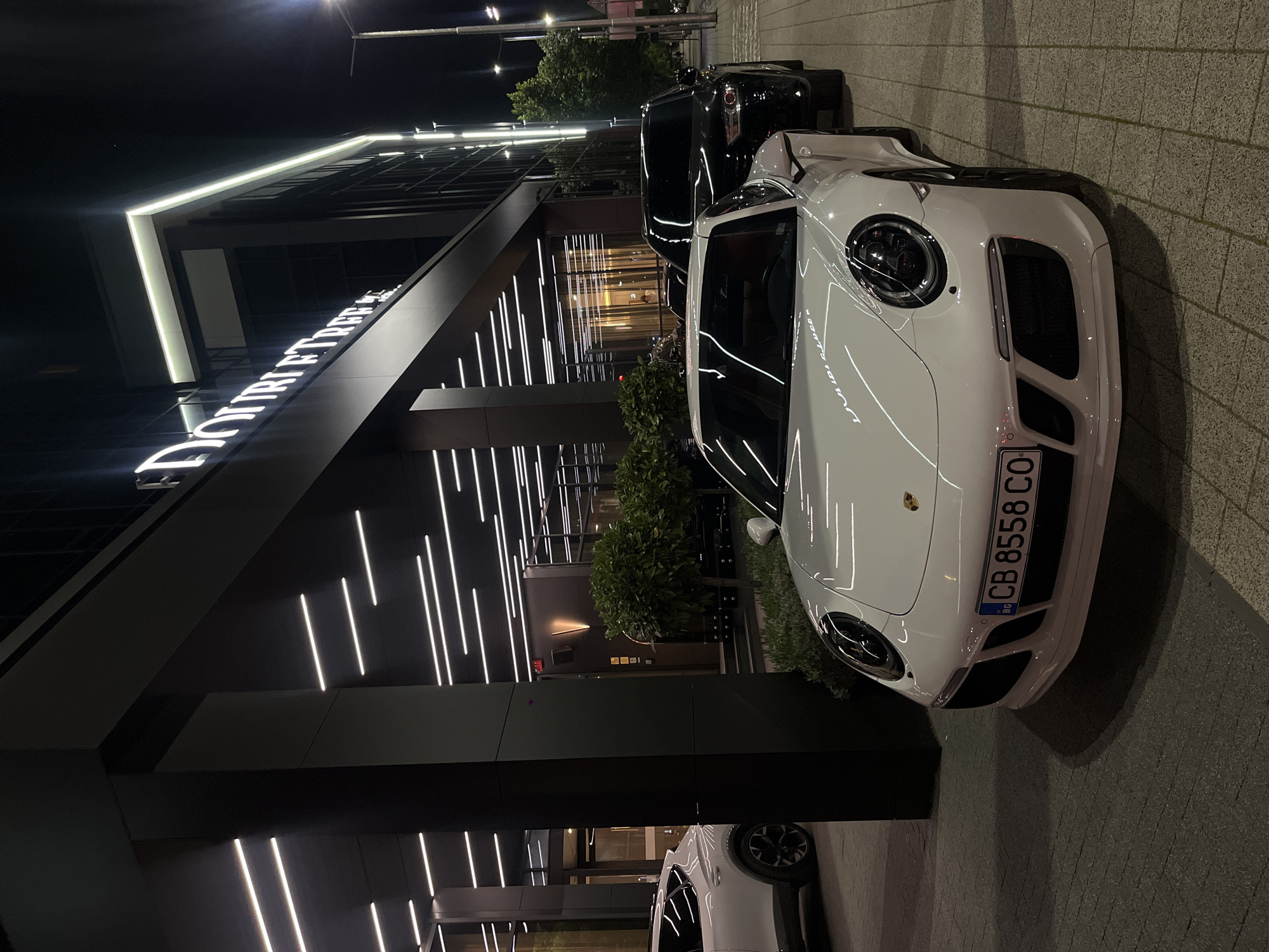 A nighttime exterior shot features a white Porsche parked on a sidewalk, with its license plate "CB 8558 CO" clearly visible