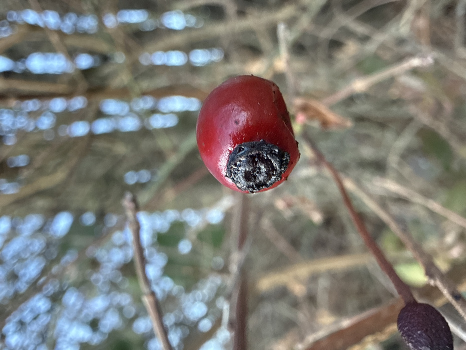 A single, vibrant red, spherical fruit, approximately 1.5 cm in diameter, is depicted in sharp focus against a blurred natural background. The fruit, resembling a rosehip, exhibits a smooth, glossy deep red surface. One end presents a distinct, roughly circular area of dark black, shriveled, and textured tissue. It is attached to a thin, reddish-brown stem that extends downwards, mostly out of focus. A smaller, darker, elongated bud or spent fruit is partially visible below the main fruit on an adjacent, out-of-focus stem. The background consists of numerous bare, brown-grey branches and twigs, heavily blurred. Multiple bright, circular bokeh highlights are scattered throughout the background, indicating natural light conditions filtering through the environment. The scene is located in Junglinster, Luxembourg.
