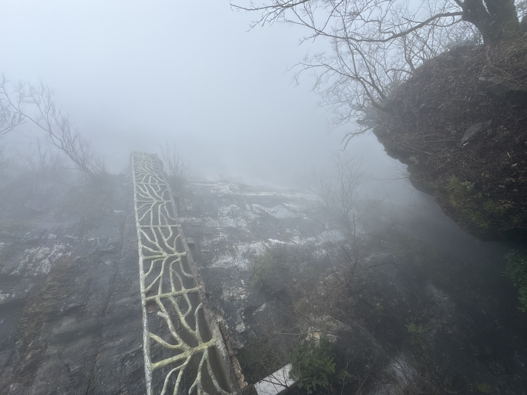 The image depicts a stone walkway with a decorative railing set against a dark, rugged rock face, enveloped in dense fog in a mountainous area of Yongding District, China. The light-colored railing features an intricate, branch-like pattern and extends diagonally from the lower-left to the upper-right of the frame. The rock face, which appears damp and textured, occupies the left side of the image, showing minimal vegetation including sparse grass, moss, and small, dark bushes. Bare tree branches, characteristic of dormant deciduous trees, are visible in the foreground and receding into the fog on the right. The right half and upper portion of the image are dominated by thick white-grey fog, which severely limits visibility and obscures any distant geological features or landscapes. No individuals, animals, or active subjects are present. The scene indicates a path constructed along a cliff edge or steep incline, with the fog concealing the extent of the drop-off or valley.