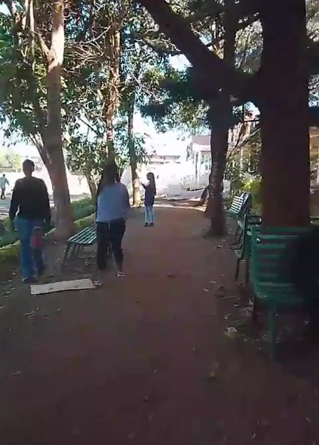 pathway through a park-like area. Several people are walking on the path, away from the camera's perspective. There are benches lining the path. Tall trees with dense foliage provide shade. The path is dirt or reddish-brown. Buildings are visible in the background. The lighting suggests it is daytime. The camera appears to be held by a person walking. There is audible chatter or conversation in the background.
