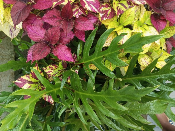 A vibrant cluster of plants fills the frame. Large, deeply lobed green leaves dominate the foreground, possibly Philodendron selloum. Behind them are several Coleus varieties, with colorful foliage in shades of yellow, pink, burgundy, and green. Some Coleus leaves display intricate patterns of stripes and blotches. The overall impression is of a lush, well-tended garden bed.