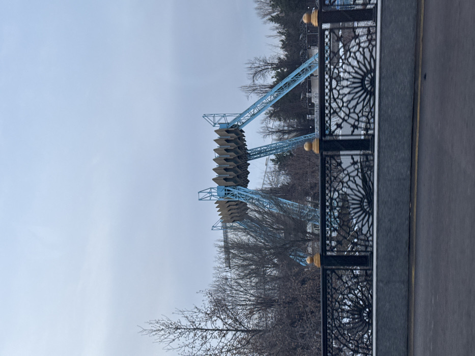 A tilted image reveals a blue ride structure in an amusement park. The ride consists of layered platforms supported by angular supports. Trees with bare branches surround the ride. A dark metal fence with decorative, sunflower-like cutouts runs along the edge of the image. The background is a gray sky.