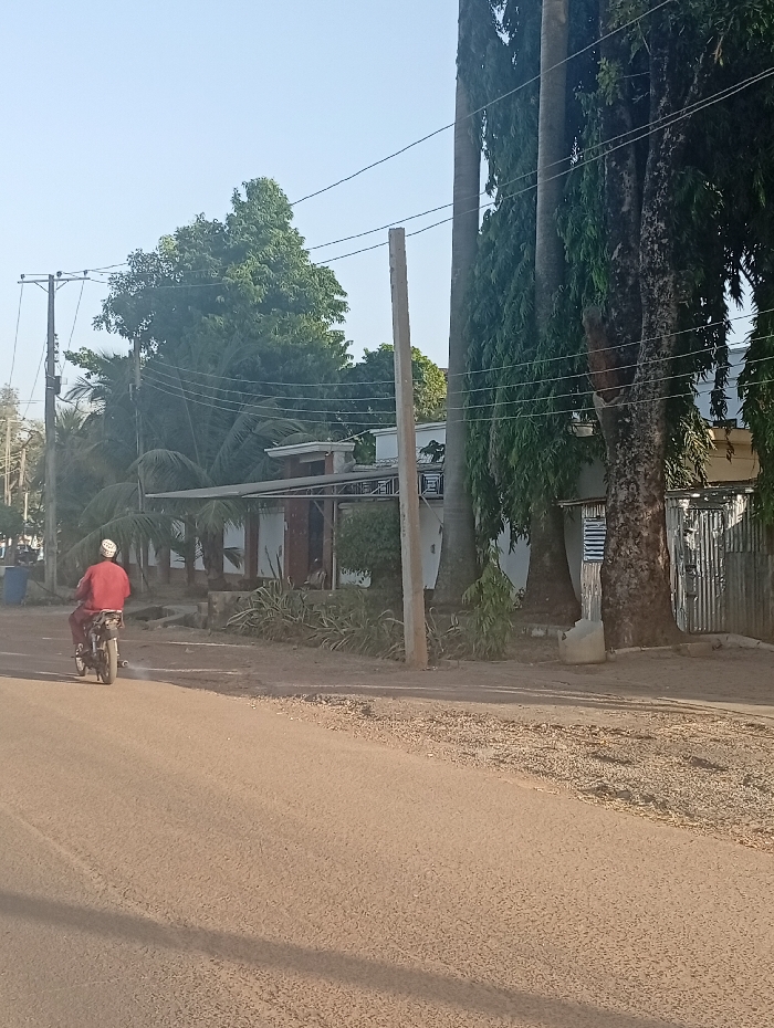 A person in red attire, including a white hat, rides a motorcycle on a road. The scene is framed by trees, power poles, and a building behind foliage. The road surface is rough, appearing sandy or dusty. The lighting suggests it's a bright day.