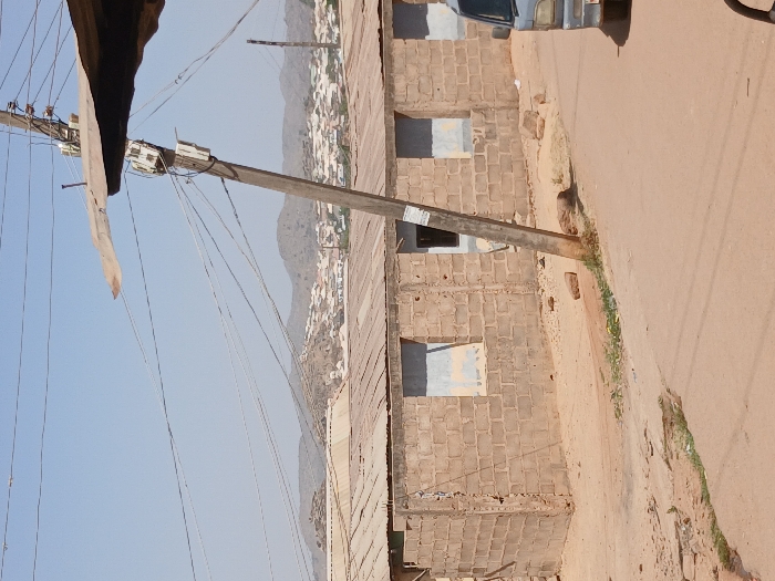 This image depicts a street scene in Jos, Nigeria, under a clear sky. In the midground, a row of unfinished single-story structures constructed from concrete blocks stretches across the frame, featuring open rectangular window and door apertures, some with faded blue or white coverings. Corrugated metal roofs top these buildings, which appear weathered. To the right of these structures, a tall, dark wooden utility pole leans significantly towards the right, bearing multiple attached electrical meters and numerous overhead electrical wires that crisscross the sky. A piece of corrugated metal is lodged near the top of the pole. The background reveals a landscape of hills dotted with numerous residential buildings. In the foreground, a paved road surface occupies the lower right, running parallel to a dirt path on the left. Scattered rocks and sparse vegetation are visible along the dirt path. The front right portion of a light-colored minivan or small truck is partially visible on the road in the far right. No individuals or specific actions are discernible.