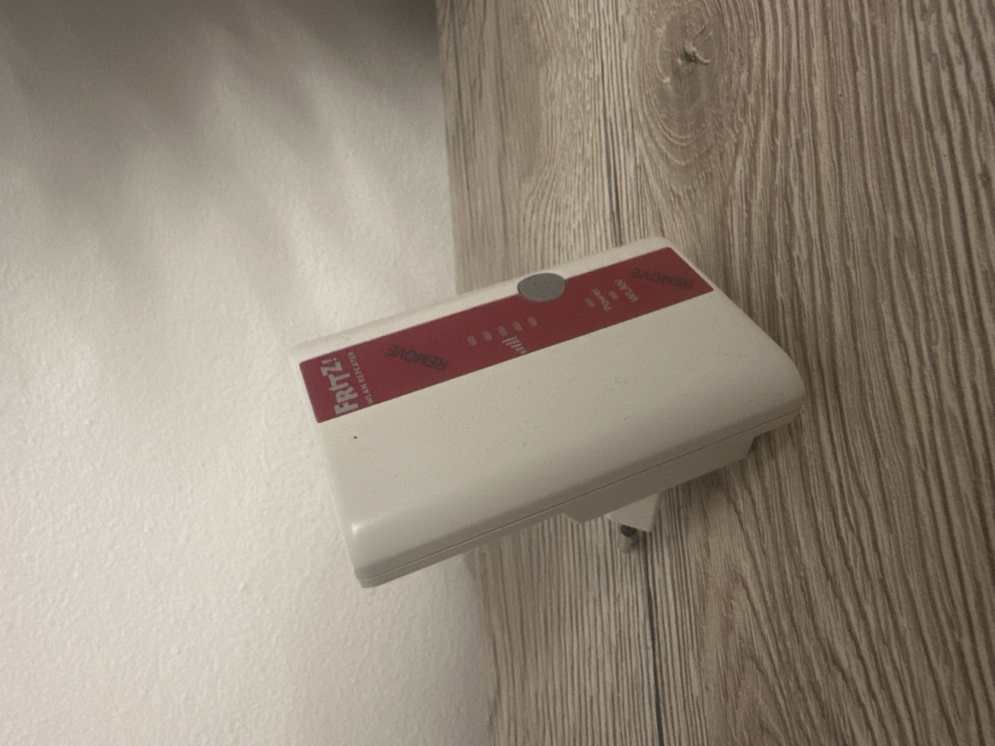 - "A white FRITZ! WLAN Repeater is plugged into a vertical surface, likely a wall or cabinet, with a wood-grain pattern" by FM-PjZ023, licensed under CC BY 4.0