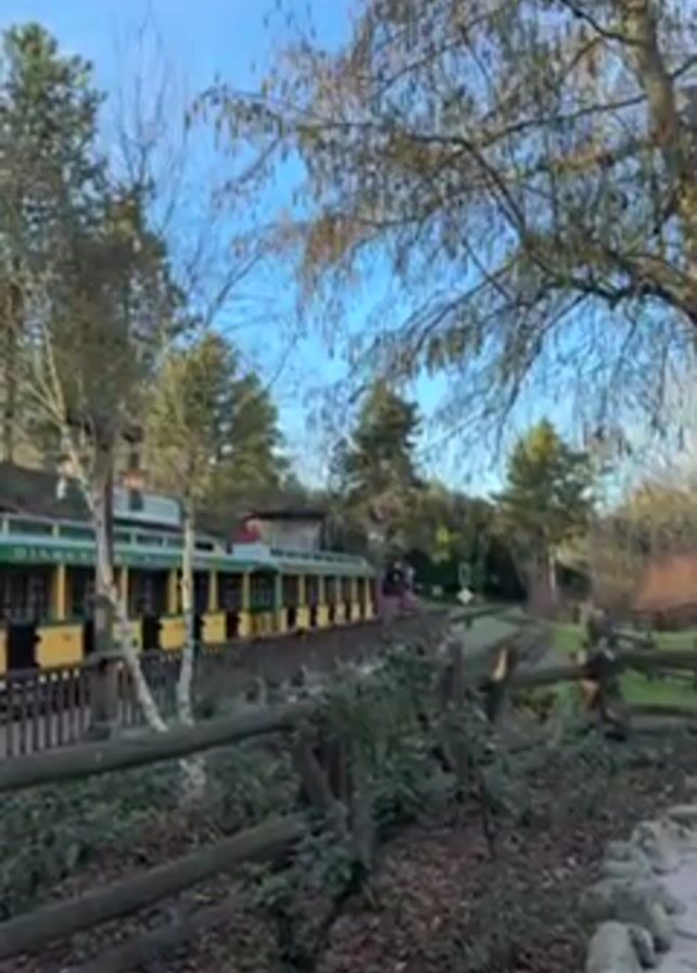 slow-moving train passing behind a split rail fence. The train consists of yellow and green passenger cars, and the station is visible to the left. The setting appears to be a park, with trees surrounding the train tracks and the fence separating the walkway from the train area. The sky is blue with some clouds. Someone is heard speaking in French in the background.
