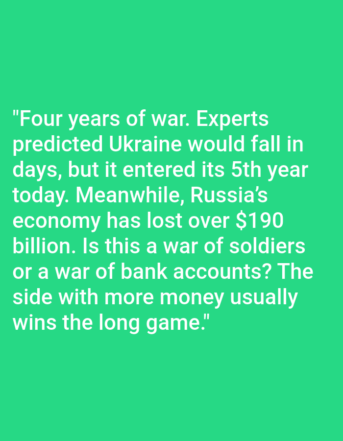 The image displays white text centered on a solid, bright green background. The text reads: "Four years of war. Experts predicted Ukraine would fall in days, but it entered its 5th year today. Meanwhile, Russia's economy has lost over $190 billion. Is this a war of soldiers or a war of bank accounts? The side with more money usually wins the long game." The image is a static graphic and does not depict a physical scene or a specific location such as the city of Гава, Kyrgyzstan. There are no individuals, physical subjects, objects, actions, or interactions present within a discernible environment other than the colored background and text itself.