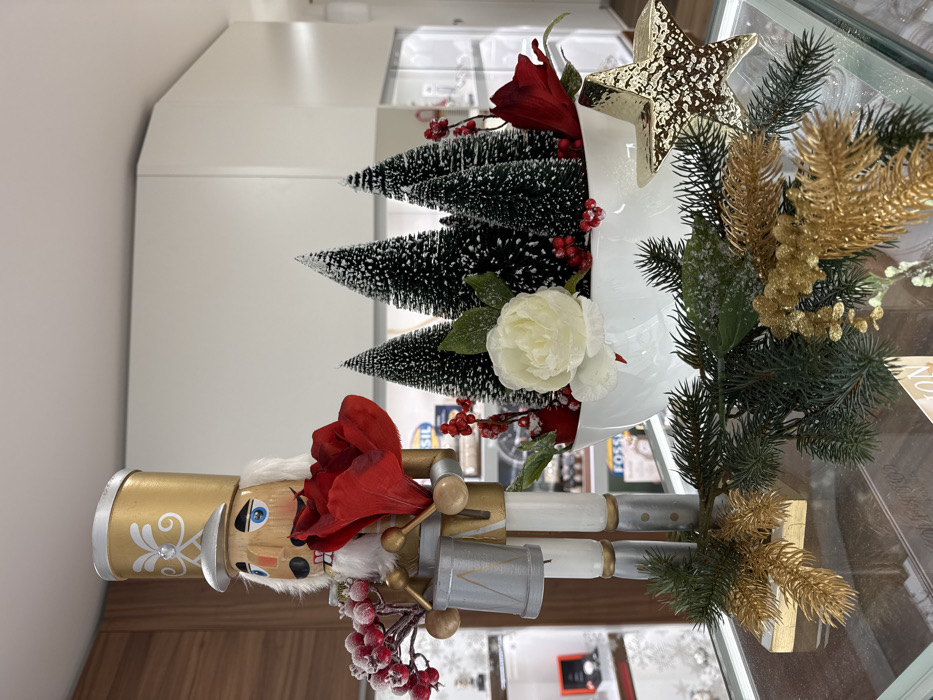 This image depicts a festive holiday retail display situated on a clear glass counter within a commercial establishment in Nuremberg, Germany. In the foreground, artificial green pine branches, some with gold glitter accents and light white flocking, are arranged on the glass surface alongside a textured, golden, five-pointed star ornament. The central display features a decorative nutcracker figure, predominantly gold, white, and gray, standing on a gold rectangular base. The nutcracker has a gold hat with silver trim, a wooden face with blue eyes and a white beard, and holds a red artificial flower in its left hand and a silver drum with drumsticks in its right hand. A sprig of red berries with white flocking is attached near its left shoulder. Adjacent to the nutcracker, an oblong white ceramic bowl contains an artificial winter scene. This scene includes several flocked miniature evergreen trees, multiple clusters of red berries, a large creamy-white artificial flower, and a smaller red artificial flower. The background reveals a brightly lit interior space with light-colored walls and wooden fixtures. Multiple glass display cases showcase merchandise, including what appears to be watches or jewelry, with a red watch box visible in one case on the left. A blue sign with the white "FOSSIL" logo is positioned behind the main display. No individuals are present in the scene.