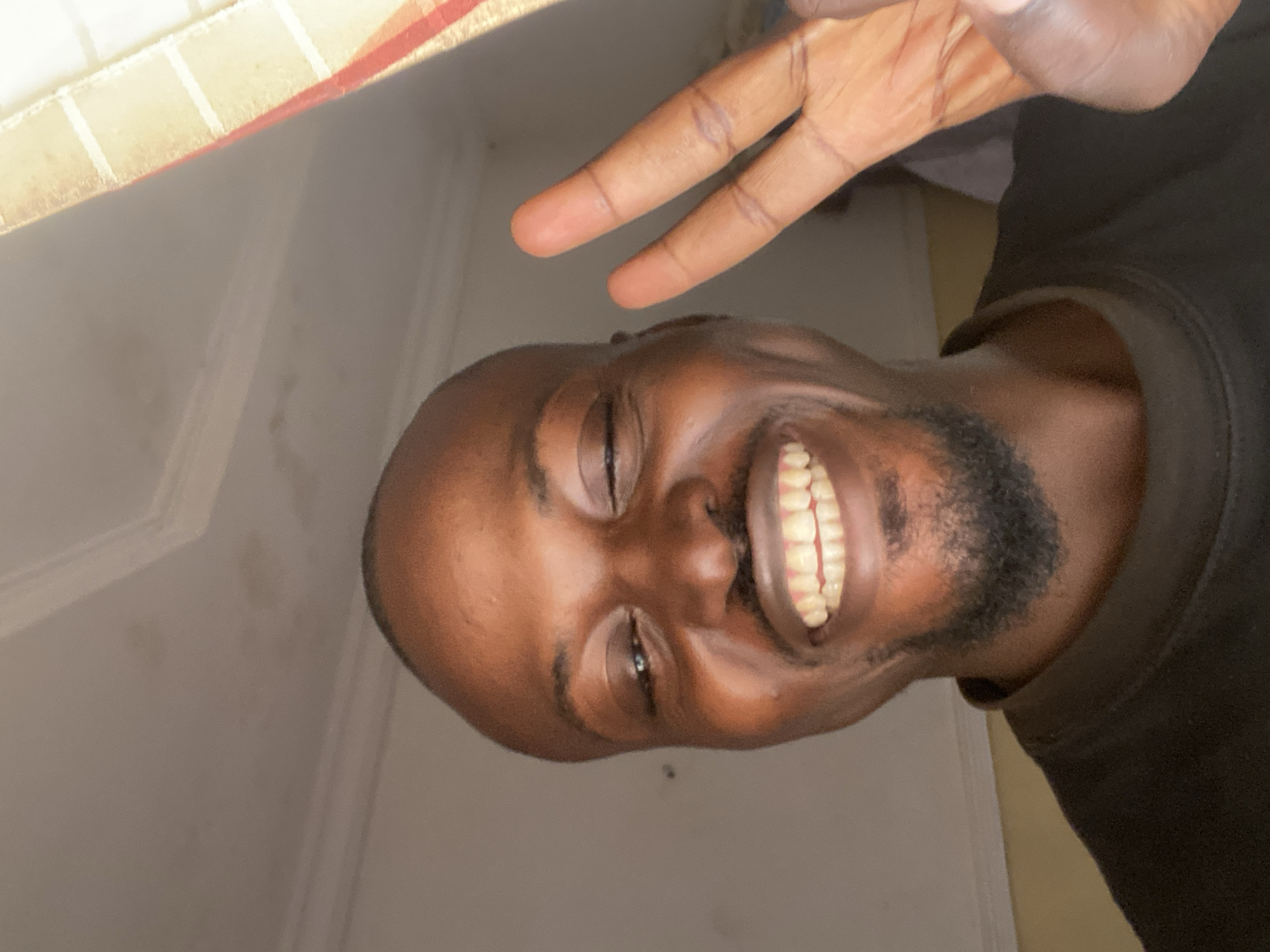 An adult male is depicted in a close-up indoor photograph taken in Kuru Dungus, Nigeria. The subject has dark skin, a shaved head, and a short beard. He is smiling broadly, exposing both upper and lower teeth, with his right eye open and his left eye closed in a wink. His right hand is raised beside his head, forming a 'V' sign with his index and middle fingers. He wears a dark-colored, crew-neck shirt. The background consists of a light-colored ceiling with visible architectural molding and minor surface discolorations. A window with a light-colored, possibly striped curtain is partially visible on the right side of the frame, indicating a source of natural illumination.