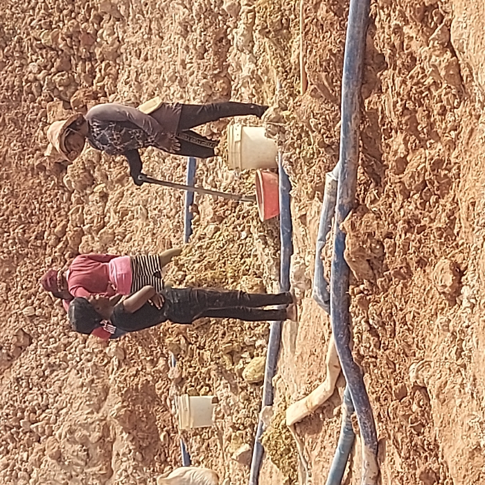 The image depicts an outdoor excavation site in Rayfield, Nigeria, characterized by a predominantly reddish-brown, loose, rocky terrain with large piles of excavated earth under bright daylight conditions. Four individuals are present. In the foreground left, a person wearing a black short-sleeved top and black trousers stands with arms crossed, observing the scene. To their right, a second individual, dressed in a dark patterned long-sleeved top, dark trousers, and a wide-brimmed light-colored hat, leans on a shovel handle inserted into the ground. Adjacent to this individual are a white plastic bucket and a red plastic basin on the ground. In the mid-ground, two other individuals are partially visible, both appearing to interact with the earth; one, positioned slightly to the left, wears a red top and striped bottoms, facing away from the viewer. Multiple blue hoses or pipes are laid horizontally across the disturbed ground in the foreground and mid-ground, some partially embedded in the earth. A white sack is partially visible on the far left. The scene suggests manual labor related to earth extraction or material processing.
