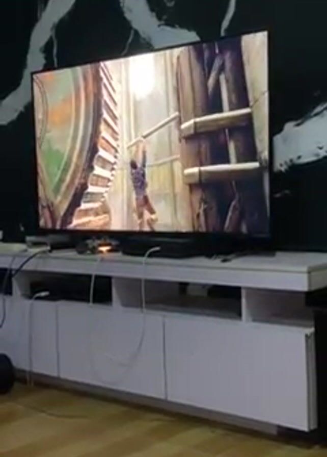 person playing a video game on a large flat-screen television. The game features a male character navigating a complex structure, climbing and moving through an environment with gears, ladders, and wooden stairs. The television is placed on a white, modern TV stand with storage compartments. Various cables are visible connecting devices on the stand. The wall behind the TV has a black and white abstract design. The floor is a wooden pattern.