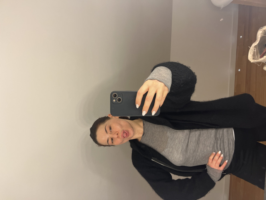 The specific location within Carency, France, cannot be determined from the provided image; the scene is an indoor setting. One adult female is depicted, taking a mirror selfie. She has dark hair, pulled back, and a fair complexion. She is wearing a light grey, long-sleeved top underneath an unzipped, dark, textured cardigan or jacket that features a silver zipper detail on the left front. The sleeves of the cardigan appear voluminous. Dark trousers or leggings are visible on her lower body. The subject is holding a dark-colored smartphone with a multi-lens camera system in her right hand, her fingernails painted white. Her left hand is positioned on her hip. She is making a facial expression with her tongue extended and lips pursed. The background consists of a plain, light-colored wall with a visible sloped ceiling, indicating an attic or mansard room. Shadows are present on the wall. The floor, visible in the lower right, is composed of light-toned wooden planks. Two circular light sources, likely recessed, are reflected on the floor/mirror surface. In the lower right corner, a light-colored fabric bag or container is situated on the floor, partially filled with dark-colored items. The lighting appears to be artificial and uniform.