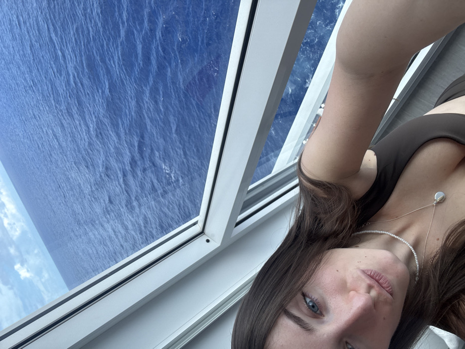 The image displays a selfie of a female individual taken from an interior cabin or room aboard a vessel, with the location at sea, in the vicinity of Unknown, Bahamas