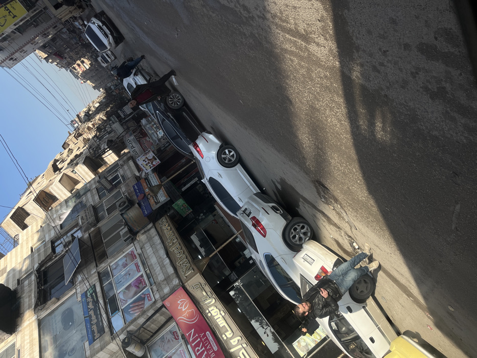 An urban street scene showcases closely parked cars along the roadside, alongside multi-story buildings with multiple shops and signage. A man in jeans and a jacket is seen lying on one of the cars. Visible signage includes "ARIN BEAUTY", "Nabeel Sweets", and what appears to be some Arabic script. Overhead, a web of electrical wires crisscrosses above the street, contributing to the bustling urban feel. The overall impression is a vibrant and congested city setting.