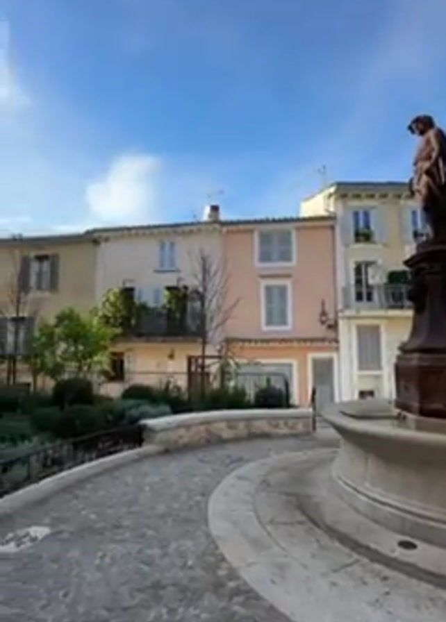 picturesque European square on a bright day. In the center is a fountain with a statue on top. The square is paved with cobblestones and surrounded by buildings painted in pastel colors with shutters. A stone barrier separates the walkway from a small garden with various plants and a large tree. The sun shines through the leaves of the tree. There is a sign near the tree, presumably with directions or information.