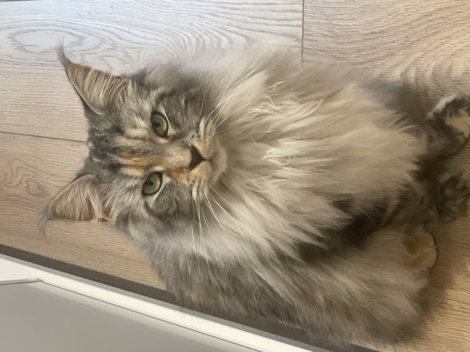 - "A long-haired domestic cat, likely a Maine Coon, with a grey and brown tabby pattern mixed with cream and orange patches (torbie/calico pattern), sits upright on a light-colored wooden floor" by FM-HSuMn2, licensed under CC BY 4.0