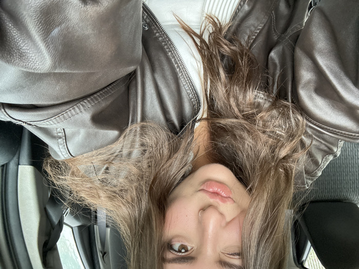 A female individual is depicted in a close-up selfie photograph taken inside a passenger vehicle