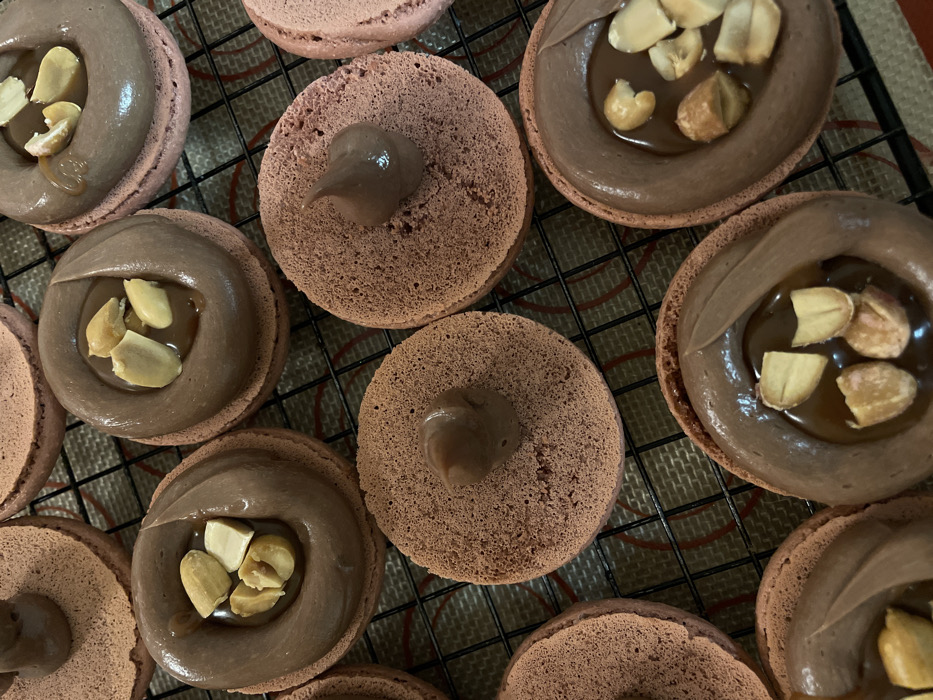 A close-up shot features several macarons arranged on a black wire rack. Some are filled with a chocolate cream piped around a caramel center topped with nut pieces. Others are simply filled with a piped dollop of chocolate cream. The macarons are mostly brown and pinkish-brown, exhibiting a slightly rough texture. The background includes a glimpse of what seems to be a silicone baking mat.