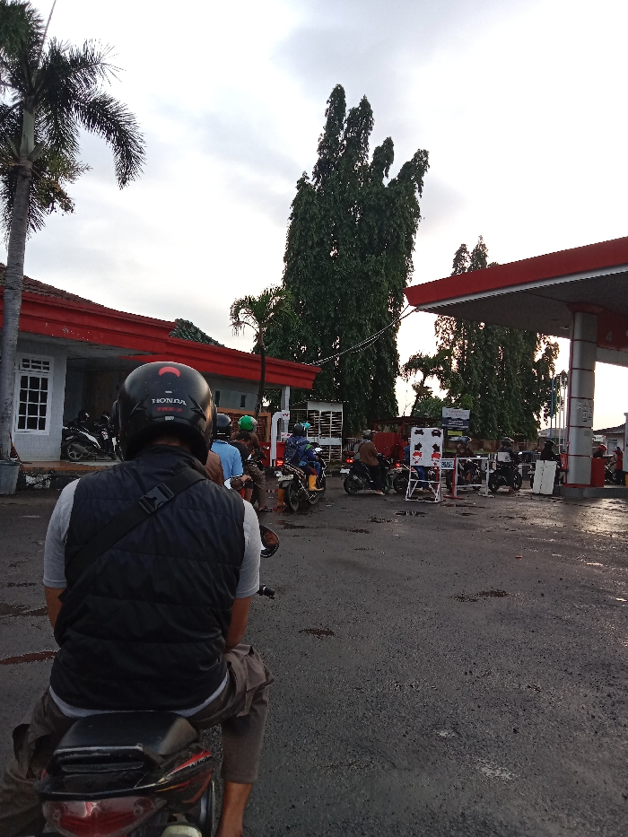 A person on a motorbike waits in line at a gas station. The person wears a helmet, vest, and grey shirt. Other motorbikes and people queue ahead. The gas station has a red roof and white pillars. A building with a red roof is on the left. Tall green trees and palm trees are visible in the background under a cloudy sky. The ground is asphalt and appears wet.