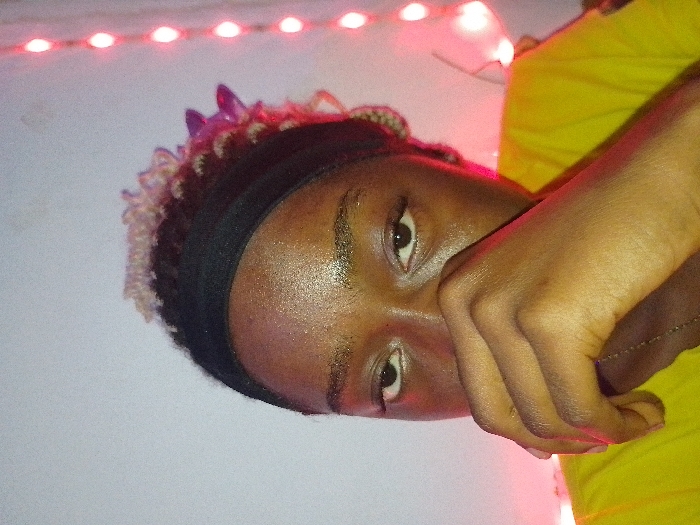 The image displays a close-up portrait of an individual in an indoor setting within Ado, Nigeria. The subject has dark skin, with open eyes directed towards the viewer, and a visible sheen on the forehead. They wear a black fabric headband, above which textured hair or a hairpiece is visible, featuring sections of light brown/blonde and purple/pink. A bright yellow garment, likely a t-shirt, is partially visible on the lower right and left of the frame. The subject's right hand is raised, partially obscuring the lower half of the face, specifically covering the nose and mouth area. A dark, thin chain or necklace is faintly visible below the chin. The background consists of a plain, light-colored wall, with a vertical string of small, illuminated red fairy lights positioned on the right side of the frame.
