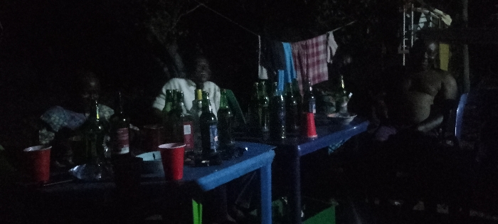 Three individuals gather around tables laden with bottles and red cups in a dimly lit outdoor setting. Clothes hang on a line behind them. The person to the right is shirtless and seated. The other two are partially obscured by the darkness and array of bottles. The tables appear to be plastic, one blue and the other partially visible. The overall atmosphere suggests a casual gathering in the dark.