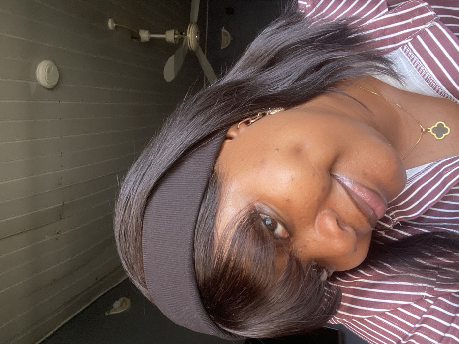 The image displays a close-up, slightly tilted portrait of an individual with dark skin, dark hair, and bangs, wearing a black headband