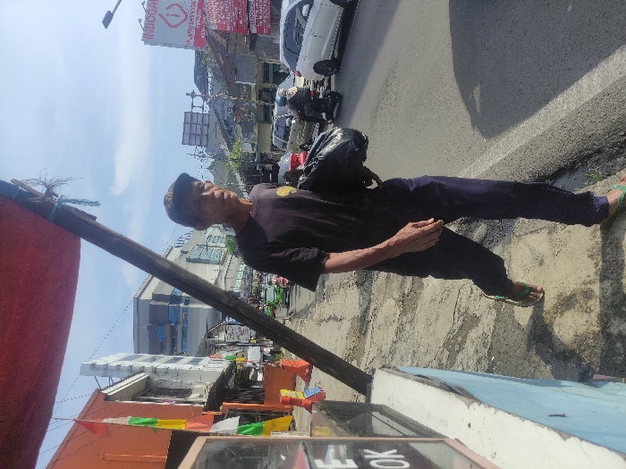 A daylight street scene in Bogor, Indonesia, features a man walking on a cracked concrete sidewalk, moving towards the viewer
