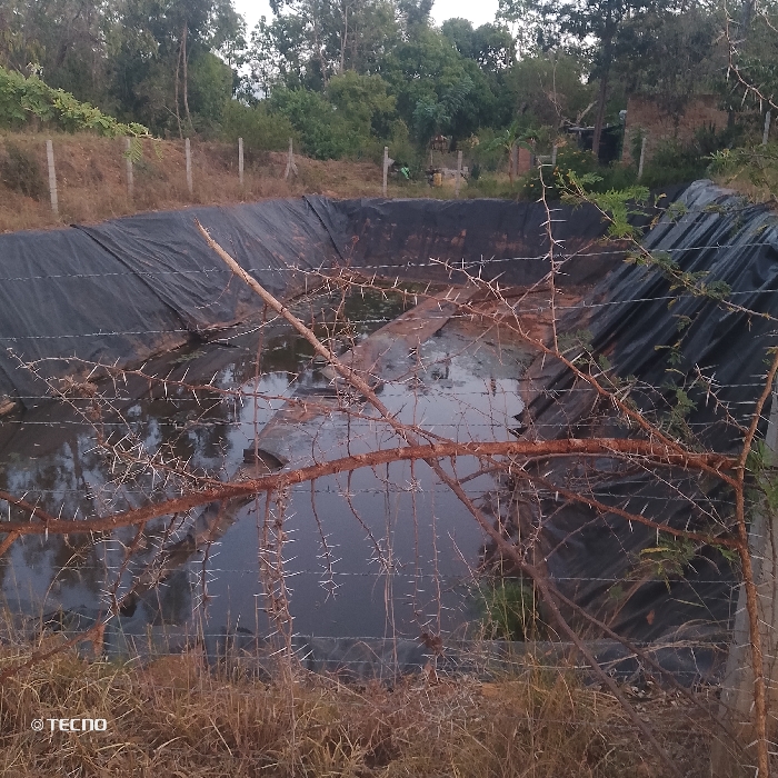 A water storage pond lined with a black plastic material is captured. The water inside reflects the sky. A thorny branch obscures part of the view, crossing in front of the pond. The pond is surrounded by a wire fence and stakes. Green trees populate the background. Grass and dry vegetation cover the ground in the foreground. A small building can be seen in the background on the right side of the pond.