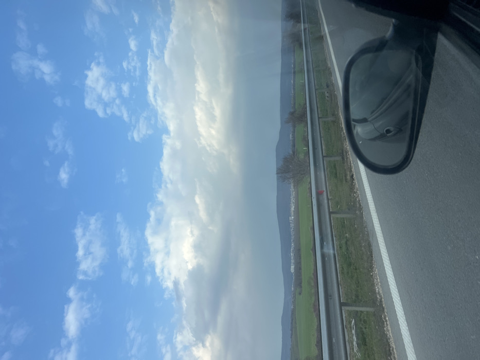 The image captures a roadside view from a moving vehicle, likely on a highway approaching Ignatievo, Bulgaria. The sky occupies the upper two-thirds, featuring a mixture of bright blue patches and scattered cumulus clouds, some dark grey and others white. A distant, low-lying urban settlement, consistent with a town or city like Ignatievo, is visible on the horizon, characterized by multiple low-rise buildings nestled against the base of dark, undulating hills. In the midground, a wide expanse of green agricultural field or pasture stretches horizontally. In the foreground, a multi-lane asphalt road with a solid white line on its right edge is prominent. A silver metal guardrail runs parallel to the road, separating it from a grassy verge where sparse, bare deciduous trees and bushes are visible. A small red rectangular marking is present on the horizontal rail of the guardrail. The black side mirror of the vehicle from which the photograph was taken is visible in the lower right corner, reflecting a portion of the vehicle's dark-colored body. No individuals or specific actions are discernible within the frame. The scene conveys a sense of travel through a rural-urban transition zone under a partially cloudy sky.