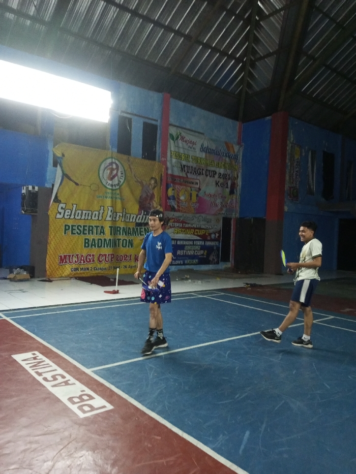 Two men stand on a blue and red badminton court, rackets in hand. The man on the left wears a blue shirt and patterned shorts, while the man on the right sports a white shirt and dark shorts with white stripes. Behind them hang banners promoting a "MUJAGI CUP 2021" badminton tournament. The banners feature text in Indonesian, alongside images of badminton players and event sponsors. The background includes walls painted blue and an industrial-style roof.