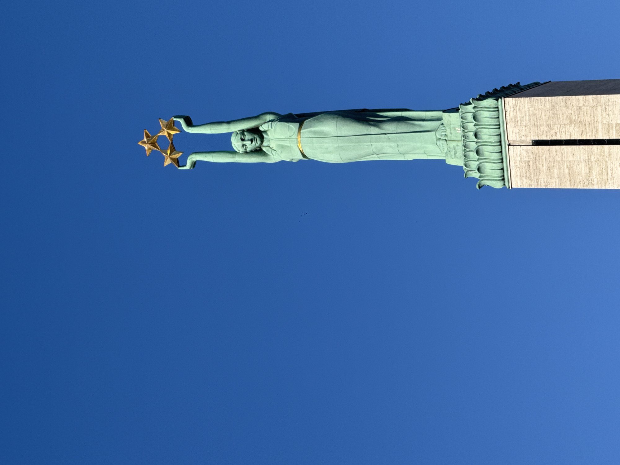 - "The image displays the upper section of the Freedom Monument (Brīvības piemineklis) in Riga, Latvia, positioned against a clear, deep blue sky" by FM-QfSw43, licensed under CC BY 4.0