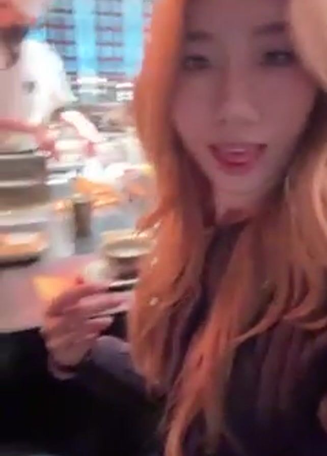 young woman with dyed, light-brown hair, wearing a dark knitted shirt, seated at a restaurant bar, possibly a Hibachi-style eatery