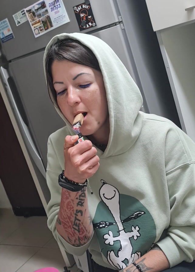 A person wearing a light green hooded sweatshirt is sitting in what appears to be a kitchen. They are holding a lighter and a small, thin, brown object (possibly a cigarillo or similar item) to their mouth. Their eyes are closed and they appear to be in the process of lighting or smoking the item. The person has tattoos on their left arm and is wearing bracelets. In the background, there is a refrigerator with magnets and papers attached to it. A round container with a pink lid can be seen to the right of the person. The camera angle is slightly tilted.