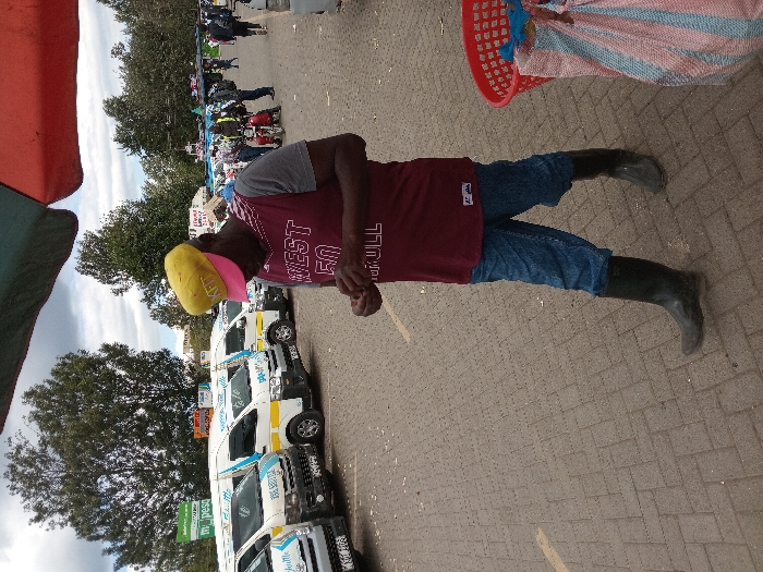 A dark-skinned adult male is observed walking from left to right across a paved public area in the City of London ward, Kenya. He wears a yellow baseball cap with a pink underside to the brim, a maroon t-shirt featuring "WEST 50" in white text with grey sleeves, blue jeans rolled up to mid-calf, and black rubber boots. His head is tilted downwards, and he is actively manipulating a small, unidentifiable object with both hands. In the left background, a row of white passenger vans, identified as matatus with "Shuttle" branding and blue and yellow decals, are parked. Behind these vehicles, green signs, including one for "m-pesa," are visible, along with distant trees under a partly cloudy sky. To the immediate right, a portion of a red plastic basket and a multi-striped (red, white, blue) woven bag are visible. Further into the right background, multiple individuals and at least one motorcycle taxi are present, indicating a busy urban environment. The ground surface consists of interlocking concrete pavers.