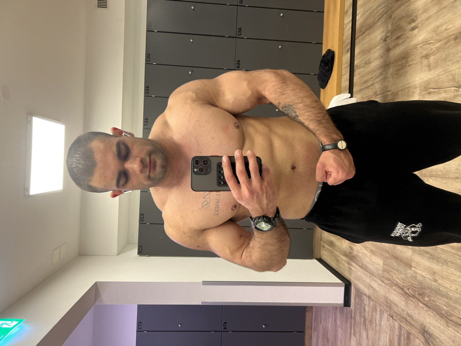 A male individual with a muscular physique is depicted in a mirror selfie taken within a gym changing room located in Basel, Switzerland