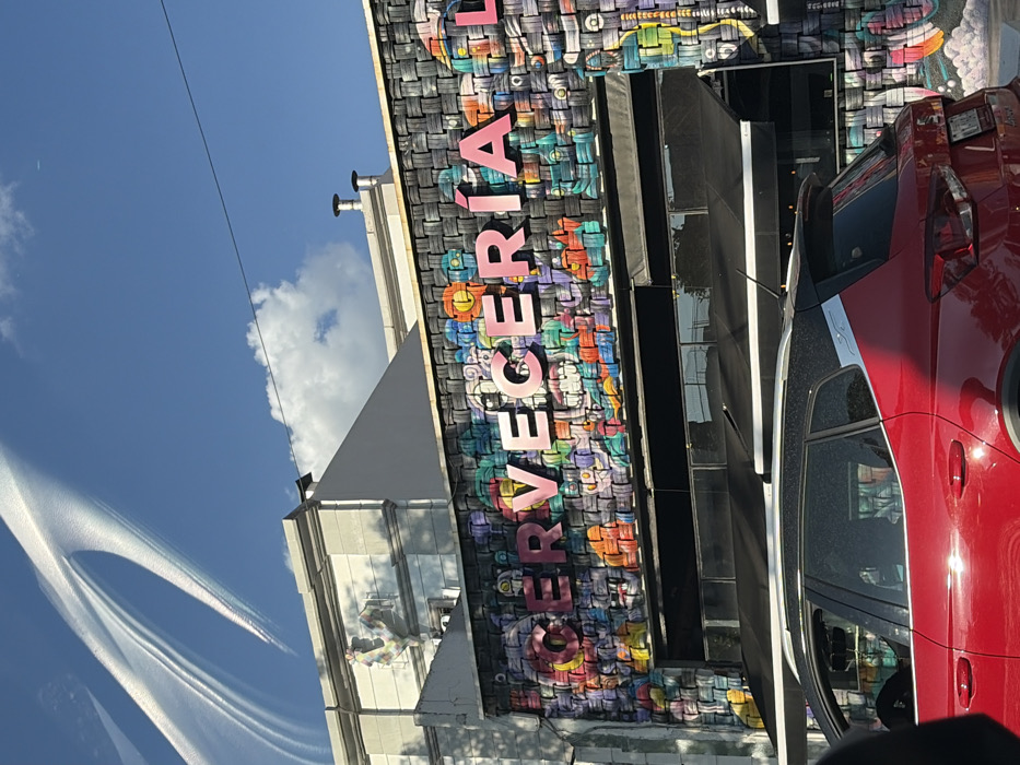A building with a colorful facade, featuring the word "CERVECERÍA" in pink letters, is seen from below against a blue sky with contrails. The building's lower part has black awning-like structures. A red car occupies the right side of the frame, partially obscuring the building. The architectural style suggests an urban environment. The image is oriented sideways.
