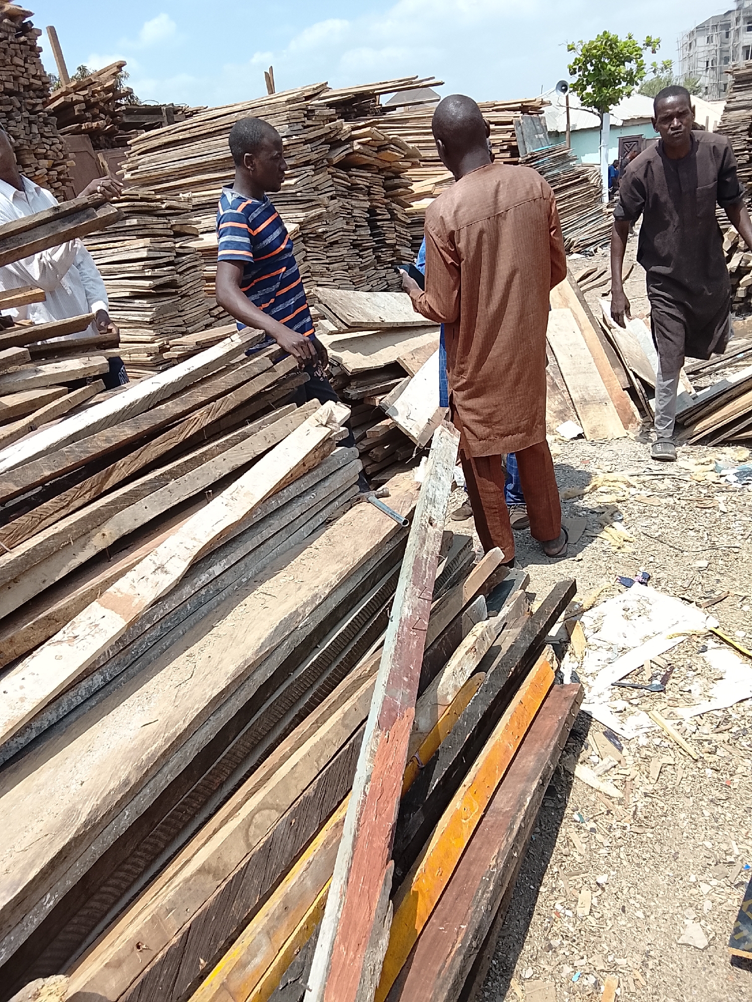 The scene depicts an active outdoor lumberyard in Abuja, Nigeria, under bright daylight with a partially clouded sky. In the foreground, numerous rough-cut wooden planks and timber pieces are stacked haphazardly on a dirt and gravel ground littered with wood scraps and debris. Four adult males are present. On the left, a man in a white long-sleeved shirt is partially visible, handling planks. Adjacent to him, a man in a blue and orange striped short-sleeved shirt stands with his hands resting on a pile of planks, facing towards the left side of the frame. In the center, a man wearing a brown long-sleeved tunic and matching trousers stands with his back mostly to the viewer, holding and looking at a smartphone. To the right, another man, dressed in a dark brown short-sleeved tunic and matching trousers, walks towards the foreground, looking directly ahead. In the mid-ground, substantial stacks of wooden planks rise high, forming a backdrop. A light blue building with a loudspeaker mounted on a pole and a small green tree are visible behind the central figures. In the far background, a multi-story building under construction can be partially seen.