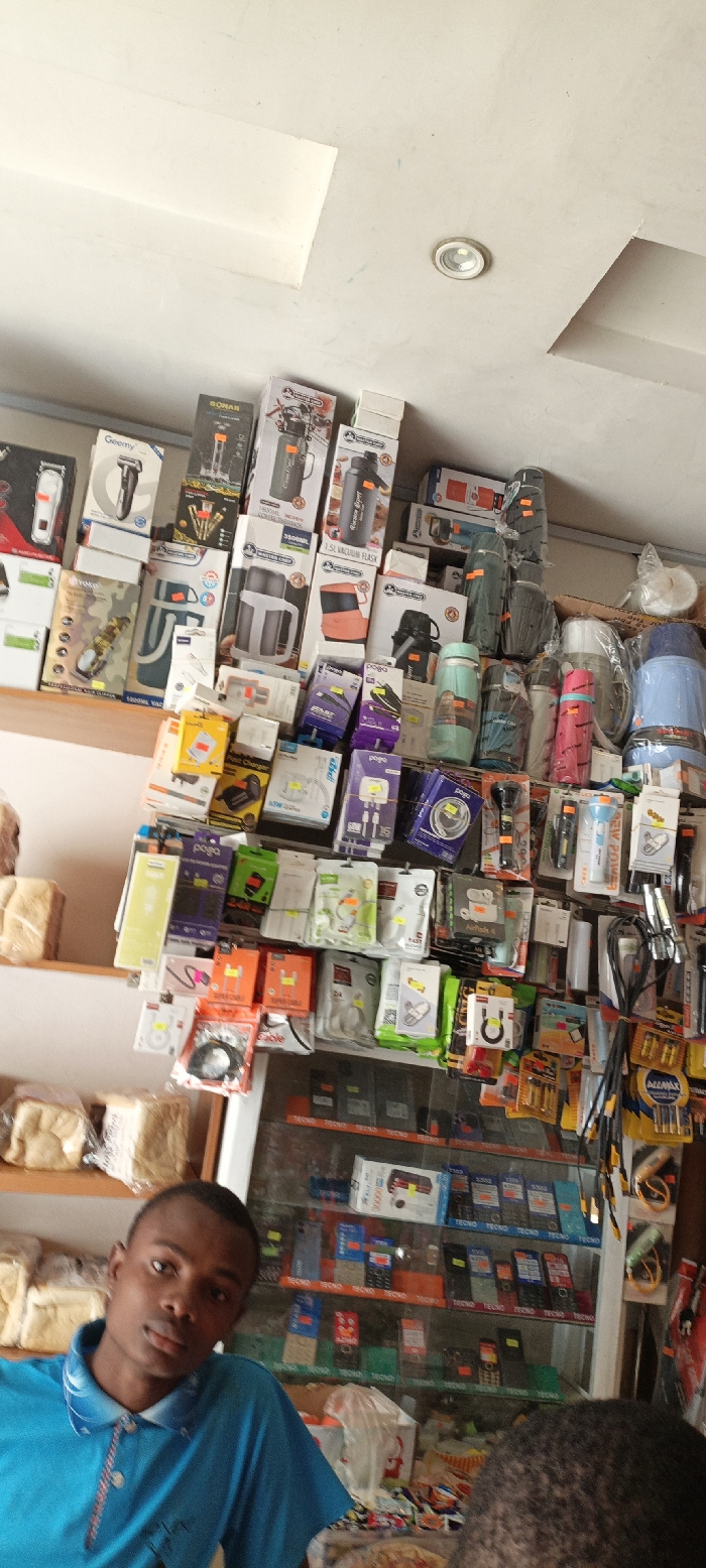 A brightly lit shop displays a variety of items. The upper shelf holds boxes of water flasks and grooming devices. Below, packages of phone chargers, cables, and batteries are arranged. A glass cabinet features numerous Tecno-branded feature phones. Two men are visible in the foreground, one wearing a blue polo shirt looking towards the camera.