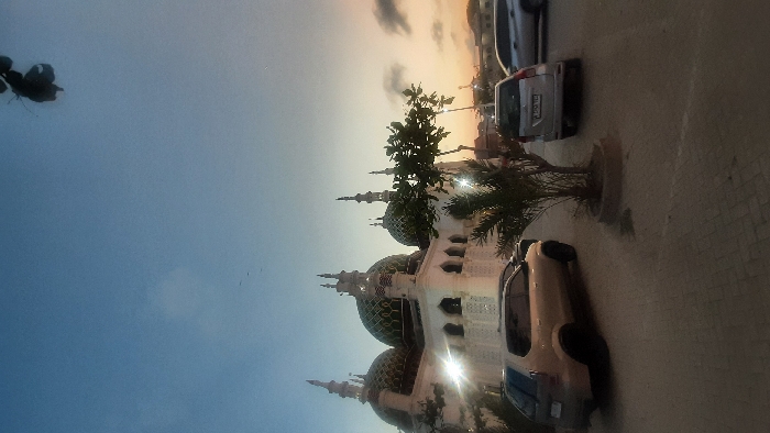 The image captures an outdoor scene at dusk in Kotapantonlabu, Indonesia, featuring a mosque as its central architectural subject. The mosque, constructed from white material, prominently displays at least three large domes adorned with green tiling and multiple tall, slender minarets capped with ornate finials. Its facade incorporates arched windows and decorative geometric patterns, with internal illumination visible through windows, creating lens flares. The foreground consists of a paved surface, indicative of a parking area or plaza. Three vehicles are present: a light-colored SUV/MPV parked on the left, oriented away from the viewer; a silver SUV/MPV parked towards the center-right, facing the viewer with a partially legible Indonesian license plate (e.g., B 2500 TGH); and a second silver SUV/MPV, partially visible on the far right, suggesting recent parking or slow movement. Vegetation includes a small palm tree situated within a circular planter in the midground, and a larger tree with dark foliage positioned to its right, partially obscuring the mosque. Overhanging dark foliage is also visible in the upper right corner of the frame. The sky transitions from a clear, light blue overhead to warmer orange and yellow tones at the horizon on the right, where faint clouds are present. Small, dark specks, consistent with birds, are discernible against the blue sky in the upper left quadrant. No individuals are visible in the scene.