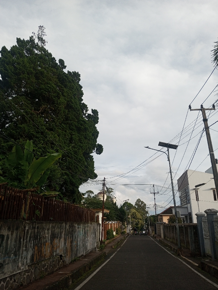 A quiet asphalt road stretches between weathered concrete walls and lush foliage under a cloudy sky. Tall trees and banana plants thrive beside a rusty corrugated fence. Overhead, power lines crisscross between utility poles. Houses peek out between the greenery. In the distance, figures on motorcycles are seen on the road. A serene residential scene with a touch of aged charm.