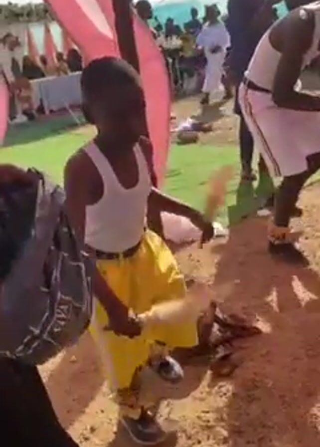 people participating in what appears to be a cultural or celebratory event outdoors. A young child in a white tank top and yellow shorts with ankle decorations is dancing. There are two men dressed similarly in white tank tops and white shorts with black trim also dancing and playing instruments, possibly flutes. Other individuals, including some wearing white clothing, are gathered in the background under a large canopy decorated with pink and orange fabric. The ground is a mix of dirt and green turf. Someone is recording the scene with a handheld device.
