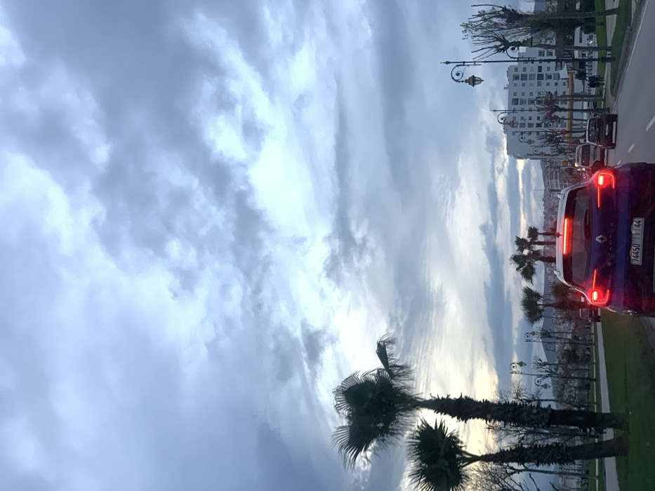The image depicts a street scene in Tétouan, Morocco, identifiable by the "11" province code on the lead vehicle's license plate. Overcast conditions are evident under a dense, grey and blue cloud cover, suggesting dusk or a heavily shadowed day. In the immediate foreground, the rear of a purple Renault Captur is visible, its brake lights illuminated, displaying Moroccan license plate '74450 11 44'. To the left, a landscaped median strip contains several tall fan palm trees and bare deciduous trees. The multi-lane road extends forward, with other vehicles, including a white van and a dark sedan, maintaining a consistent flow of traffic. Ornate streetlights line the right side of the road, where multi-story residential or commercial buildings form a backdrop, with distant hills or mountains visible beneath the horizon. Several pedestrians are present on the sidewalk to the right.