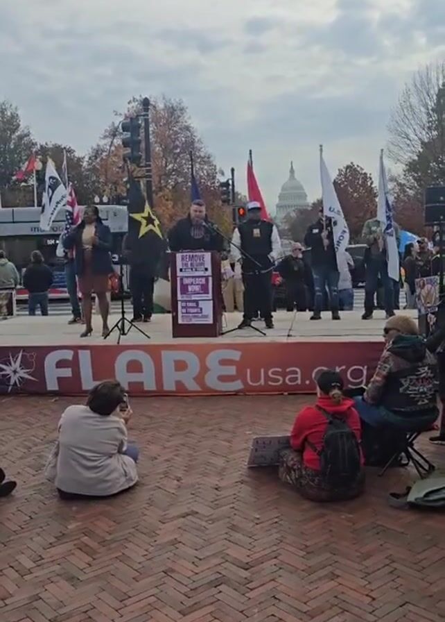 demonstration, likely a protest, taking place in front of the United States Capitol Building. A speaker is addressing a crowd from a stage that is set up on a brick plaza. The backdrop of the stage is a banner with the word "FLAREusa.org". The speaker is addressing the crowd while standing behind a podium with the words "REMOVE THE IMPERIALIST". Various people are standing and sitting on the plaza, listening to the speaker. Several flags are displayed on the stage, and one protester holds a sign that reads "TICK TOCK MFKRS". The weather appears to be overcast, and the overall atmosphere suggests a politically charged gathering.