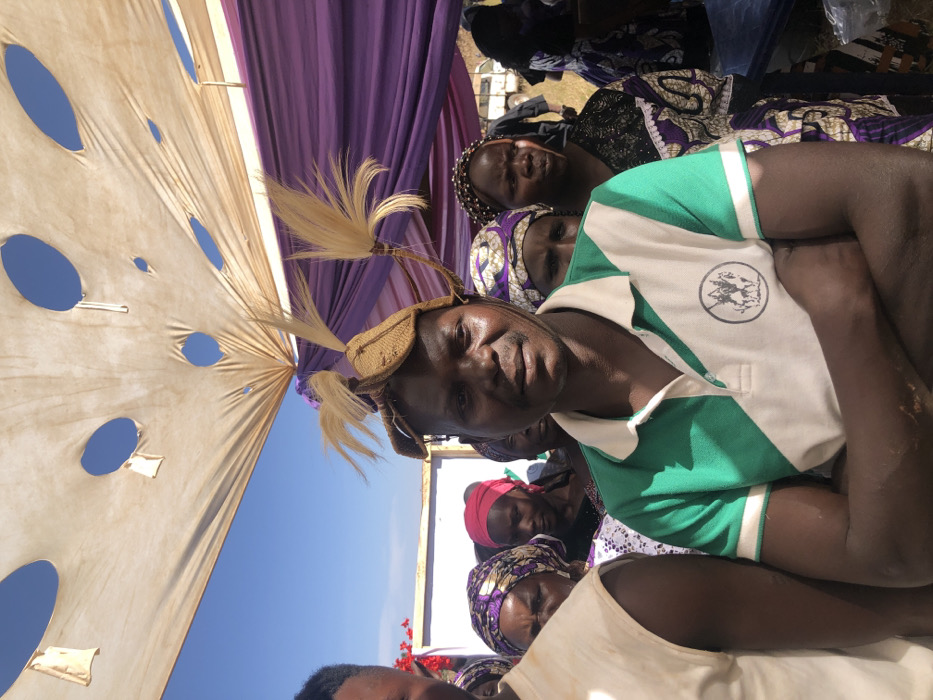 This image depicts an outdoor gathering, stated to be in Kerang, Nigeria, beneath a makeshift canopy on a clear day