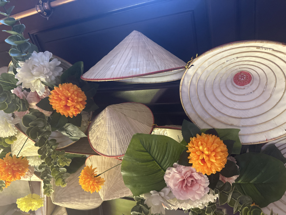 A decorative arrangement featuring multiple Vietnamese conical hats (nón lá) intertwined with artificial flowers and foliage is depicted