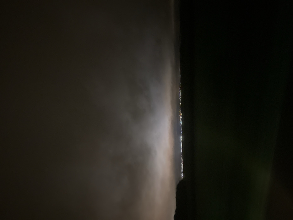 A night-time panoramic image depicts the landscape of Saint-Nom-la-Bretèche, France, viewed from a distance. The upper two-thirds of the frame are dominated by a heavily clouded, dark gray sky. Significant light pollution emanating from the distant settlement illuminates the underside of the clouds, creating a diffused, yellowish-white and orange glow along the horizon line. A continuous line of small, blurred artificial lights, consistent with an urban or suburban area, extends horizontally across the middle distance, indicating the location of Saint-Nom-la-Bretèche. The foreground and midground, comprising the lower third of the image, are rendered in deep shadow, showing indistinct dark land, possibly open fields. A dark, silhouetted landmass or treeline is visible on the far left, bordering the horizon. No specific individuals, identifiable objects, or discernible actions are present in the immediate vicinity or detailed within the distant town.