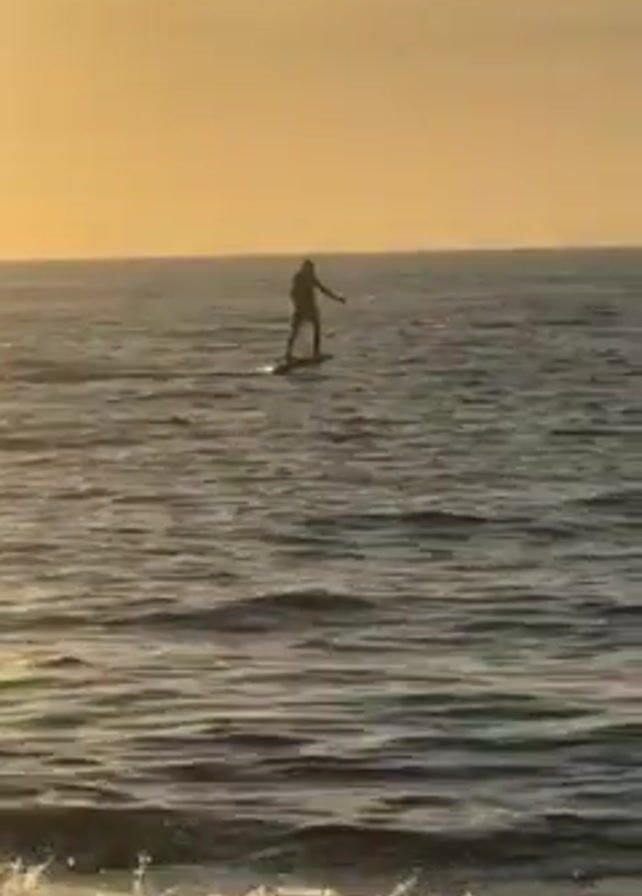 In the video, a person is riding a hydrofoil surfboard on the ocean at sunset