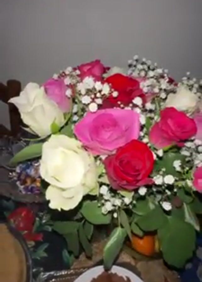 bouquet of roses in shades of white, pink, and red, interspersed with baby's breath, on a floral patterned tablecloth. A plate with a piece of what appears to be chocolate cake is in the foreground. A pie or cake in a silver tin is also visible. The roses are fully bloomed. The background is a plain white wall. The camera pans slowly around the roses.