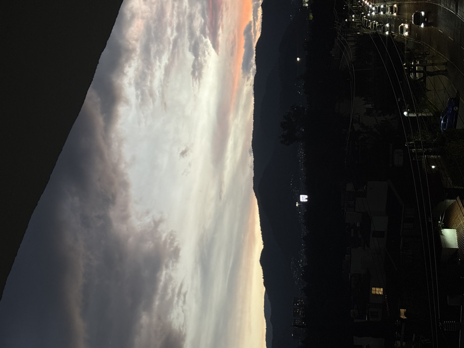 A dramatic sky fills the left half of the frame with dark, stormy clouds and bands of pastel colors. A mountain range creates a stark contrast against the colorful sky. The right side is dark, revealing glimpses of city lights, a road lined with parked cars and streetlights, and some nearby buildings. Electrical wires crisscross in the darkness near the right edge.
