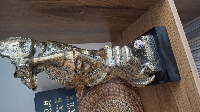 A gilded "Speak No Evil" statue is situated on a bookshelf. The sculpture depicts a skeleton-like figure with a hand covering its mouth. Below it are a book and a decorative plate. A single white die with red pips hovers near the hand, appearing to be an added digital element. The bookshelf is made of wood with a dark-grain finish.